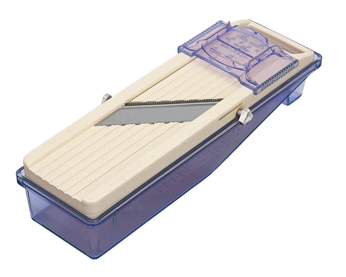 Benriner Vegetable Slicer with Holder, made in Japan, with thickness adjustment. Makes amazing garnishing as thin as 0.5mm to a thickness of 3mm.