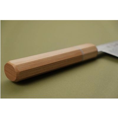 La magnifique série de couteaux MOKUZAI de Sekiryu est forgée en acier inoxydable VG-10 et trempée à 61 HRC. La lame est recouverte de 33 couches d'acier doux, créant ainsi un magnifique motif damassé, et le manche octogonal magnifiquement texturé a été teinté dans une couleur noyer qui contraste magnifiquement avec la lame argentée.